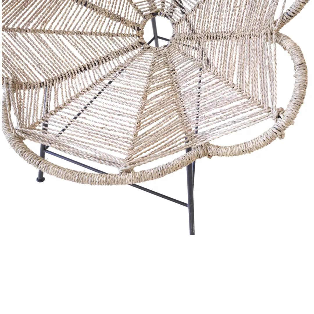 Onbevlekte handgemaakte stoel met geweven palmbladeren en zwart smeedijzeren poten