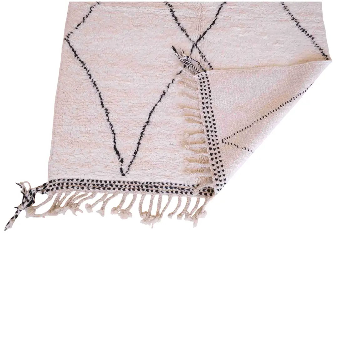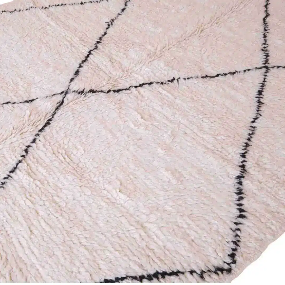 Hand-knotted from high-quality natural virgin wool, this rug embodies minimalist design with its creamy background and geometric black shapes.