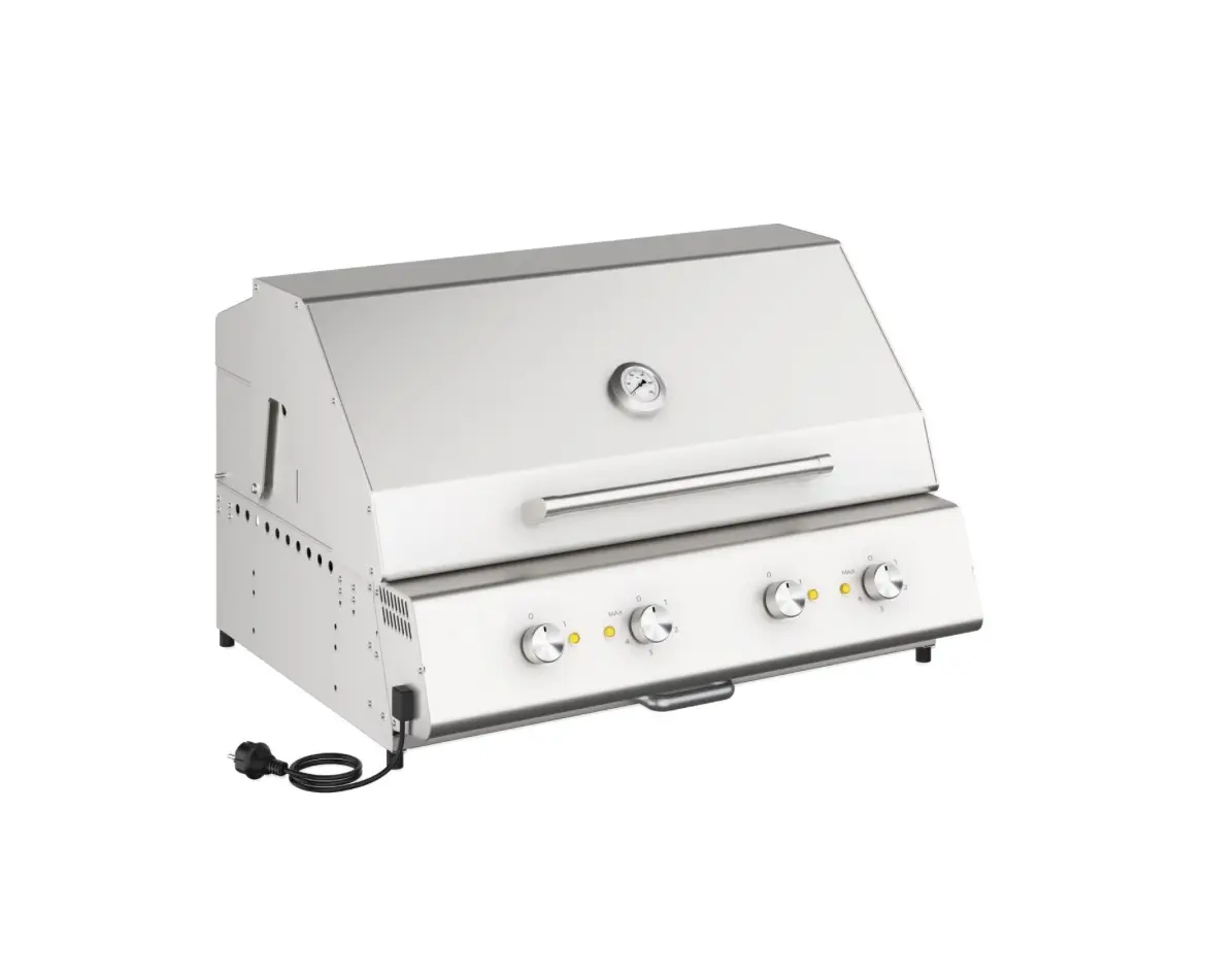 The BBQ is constructed from high-quality stainless steel, ensuring durability and resistance to outdoor conditions. It is electrically powered, featuring two 220V-240V (50/60 Hz) resistors with a total power output of 6KW, providing efficient and consistent heating for an optimal cooking experience.