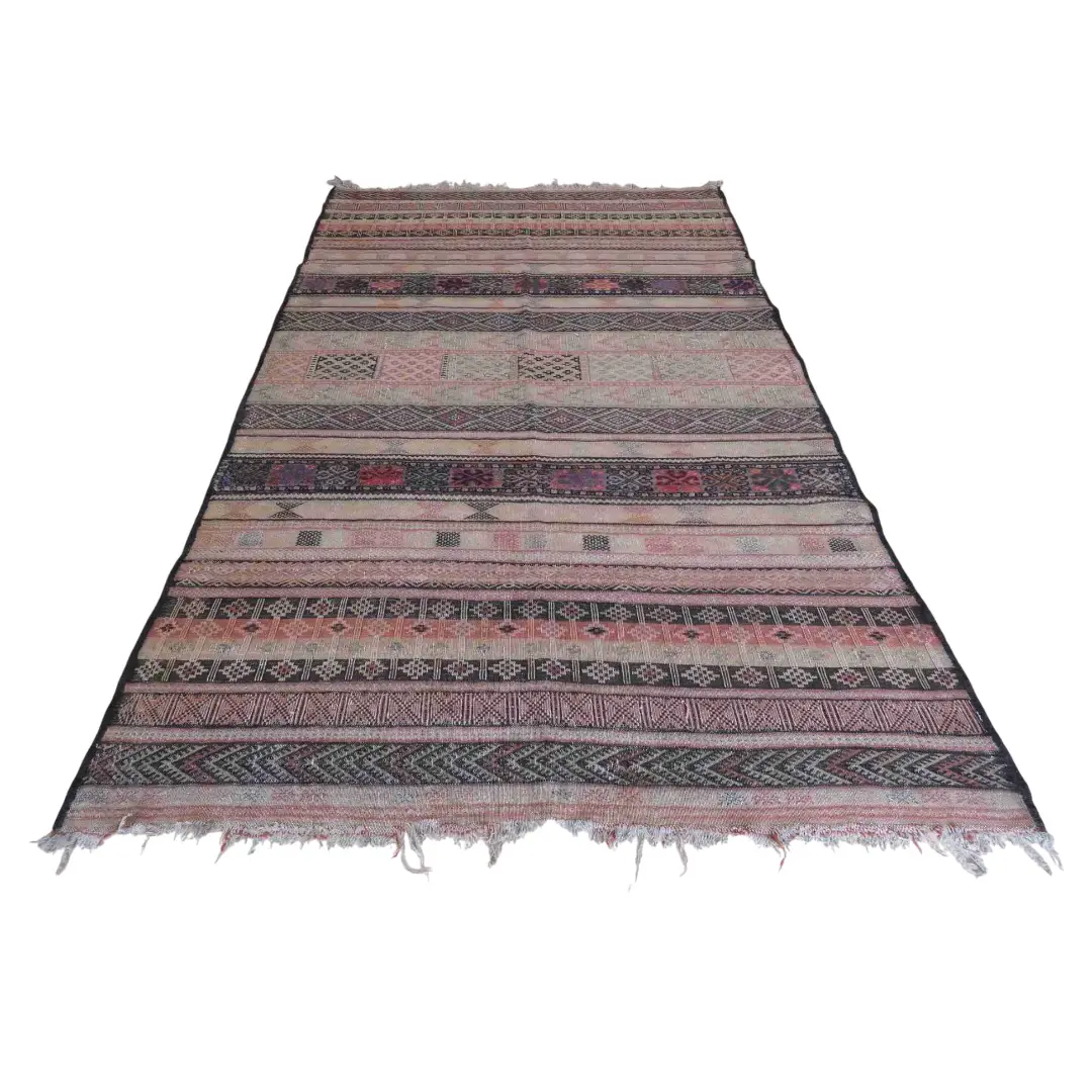 This rug boasts a playful design with a unique palette and intricate patterns, starting with organized motifs that evolve into complex, rhythmic stripes, culminating in stunning symmetry. Versatile and stylish, it effortlessly enhances both indoor and outdoor settings, doubling as a cozy and natural bedspread.